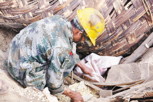 “最让人心酸的,是震区老百姓的损失”,4号早晨,当蒋朝忠走进震区的时候,一对坐在倒塌的土基房面前的夫妇叫住了救援队伍,“五六岁的姐弟两都被压在房子下面了。整面墙都倒了,墙的厚度至少有50公分,从经验来讲,孩子的幸存几率不大。但为人父母,我们还是希望孩子能活下来”。30个钟头后,两个孩子被挖了出来。看到两个灰黄色的小小身躯那一刻,蒋朝忠落泪了。