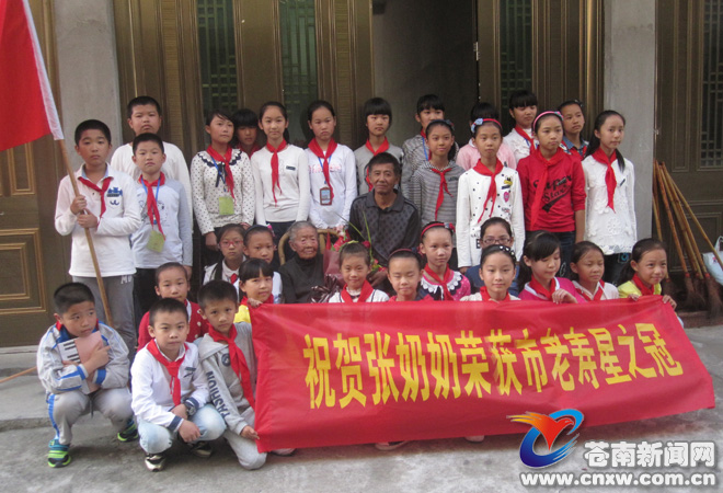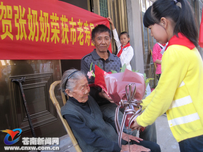 苍南新闻网11月2日消息:10月31日,赤溪小学的少先队员手捧鲜花到该镇北岙村看望老寿星张香梅,在张奶奶家门口举行祝贺她荣获老寿星之冠文艺慰问演出,还为老人打扫卫生。据悉,张香梅今年114岁,名列第五届温州十大寿星排行榜榜首。近日她接到证书和印有她的头像的一套共十枚寿星邮票。(邱新福/摄)
