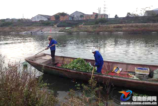 苍南新闻网11月2日消息:近日,萧江塘河河面上漂浮着大面积的水葫芦,灵溪镇积极组织河道保洁员对河面进行清理,防止水质恶化,污染水源。 (许师师/摄)