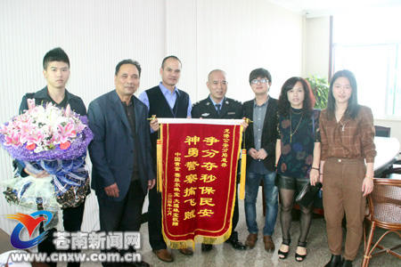 苍南新闻网11月12日消息:近日凌晨2时许,龙港公安分局刑侦民警方星安连续奋战,一路追击,在宁波鄞州区抓获湖南籍犯罪嫌疑人刘某,速破辖区三起抢夺金项链案件,及时追回总价值达5万余元的黄金项链及部分赃款。当地三名受害者将写有“争分夺秒保民安、神勇警察擒飞贼”锦旗送给民警方星安,再三言谢。(薛建贺 陈新奥)