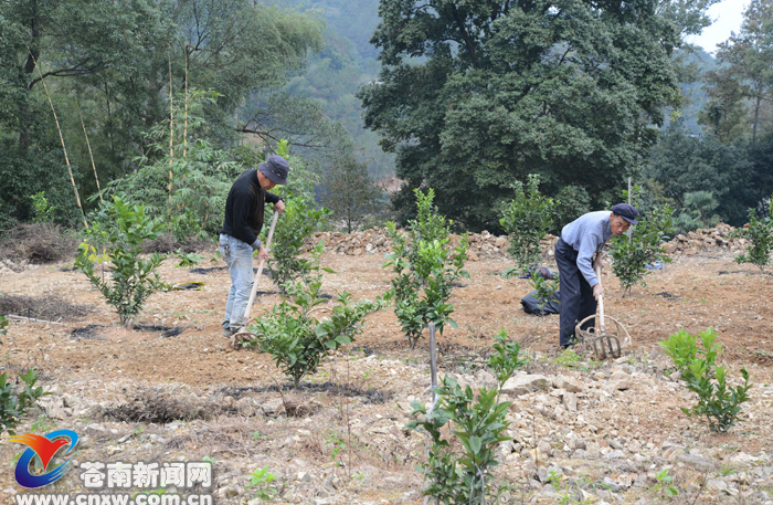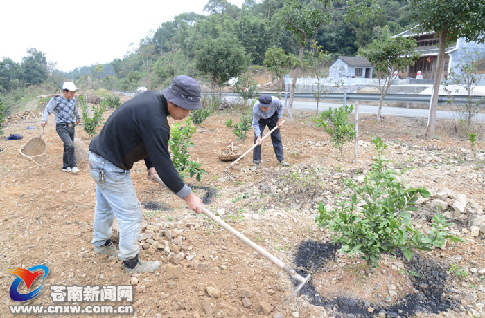 苍南新闻网12月10日消息:灵溪镇观美社区三美村村民利用公路旁闲杂地,种植经济作物,实现经济效益与生态效益双丰收。图为村民在232省道三美村鲈鳗窟段一侧沿线开垦种植200株脐橙。 (许师师/摄)