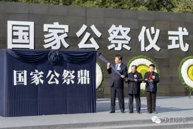 鼎立于世,铭文昭昭,中国成语有言:“一言九鼎”。今天,就在这庄重的鼎身之侧,就在这庄严的公祭之日,习近平主席把中国人民的心声宣布给世界: