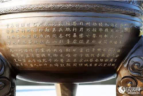 “昭昭前事,惕惕后人”,不忘前事、以鉴后世,昭明曾经铁骑横行的军国怎样在邻国的土地上屠刀起落、疯狂失控,惕戒曾经一衣带水的友邦因何在贪婪的欲望下战火肆蔓、炼狱人间,这些血泪斑驳被铭刻鼎身,是希望这份历史的错误能在“前事不忘,后事之师”的正确态度下,借鼎卦之象而化生为熟、革故鼎新,告别野蛮、文明和平。