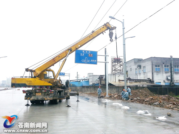 苍南新闻网12月21日消息:新修的金乡大道大部分路面已竣工,过往车辆、行人比较多,但晚上没有路灯黑乎乎一片,出行非常不便。连日来,金乡供电所工人加班加点,为新修建的金乡大道安装路灯。 (周元斌/摄)