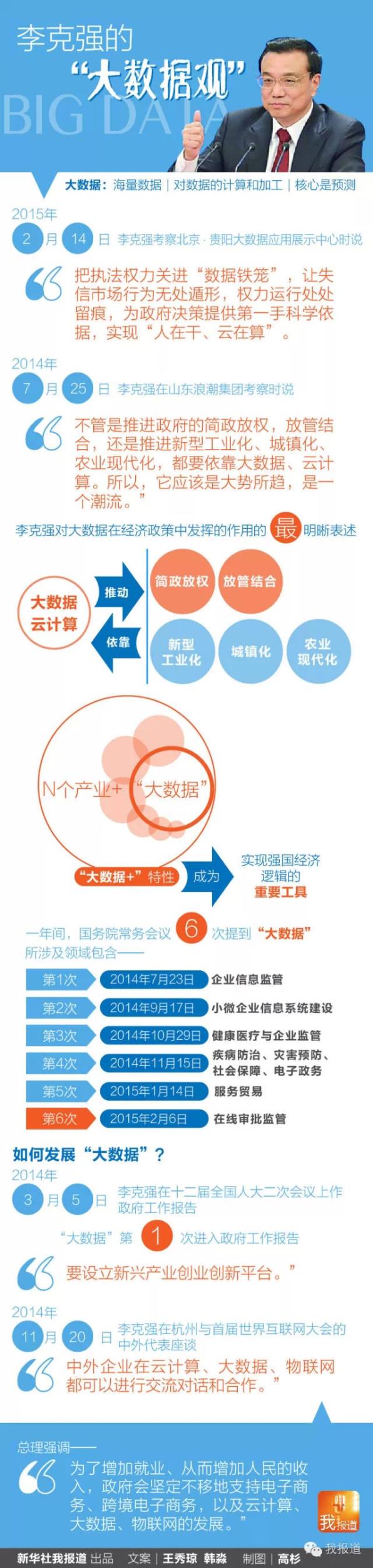 这已经是进入新年以来,“大数据”第四次出现在总理活动的公开报道中。实际上,自去年3月第一次出现在政府工作报告中以来,“大数据”一词就被拥有经济学博士学位的李克强多次提及。