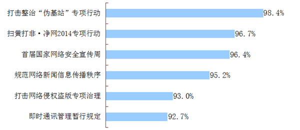 网民对于中央政府发起的各项网络治理行动总体表示关注,百度以“网络治理”为关键词的相关搜索结果有近50万条,新浪微博相关贴文近350万条。在高关注度下,网民对于互联网治理行动表示出高度支持。调查显示,网民对6项网络治理行动的支持率均超过了90%。有4项治理行动的支持度超过了95%。其中,98.4%的网民表示支持“打击整治伪基站专项行动”,96.7%的网民表示支持“扫黄打非.净网2014专项行动”,96.4%的网民表示支持“首届国家网络安全宣传周”,95.2%的网民表示支持“规范网络新闻信息传播秩序专项行动”。