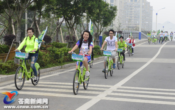 苍南新闻网6月7日消息:日前,灵溪镇部分单车骑行爱好者上街骑行,单车上打着“绿色出行,低碳生活更健康”“节能我行动,低碳新生活”等环保宣传旗,沿路宣传环保理念。 (李士明/摄)