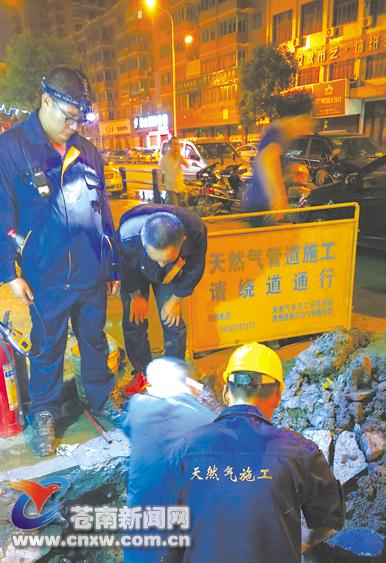 苍南新闻网6月22日消息:温州港耀天然气有限公司担负龙港企事业居民安全用气的重任。端午期间,该公司员工在龙港人民路方城丽园段挑灯抢修管道,确保居民用气安全。 (钟威龙摄)