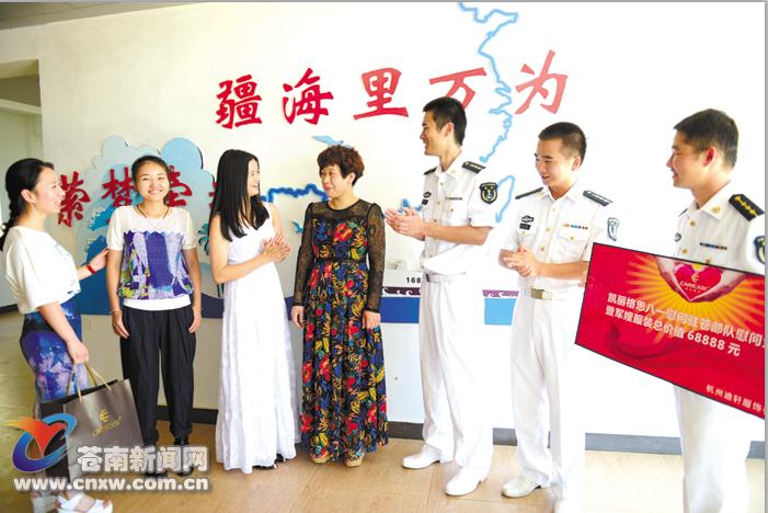 苍南新闻网7月27日消息:今日,苍南籍企业家创办的杭州迪轩服饰有限公司负责人携员工专程到驻鹤顶山部队,为军嫂送去时装并向她们表达了节日的问候,受到了官兵的欢迎。(李士明/摄)