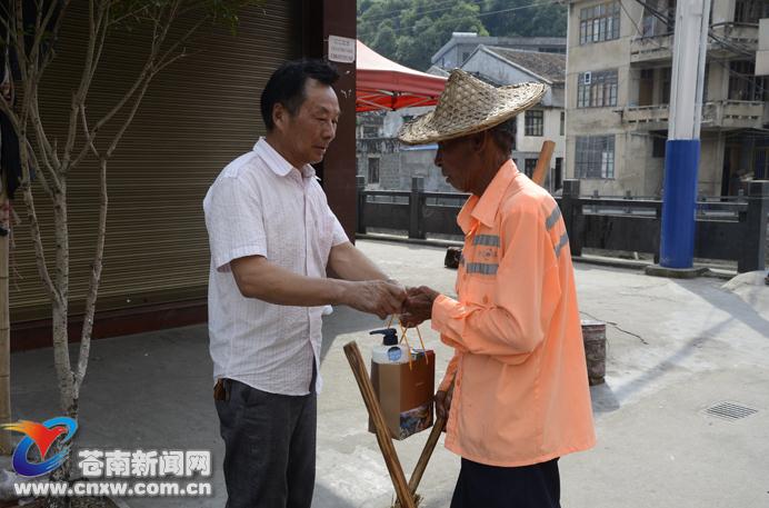 苍南新闻网7月29日消息:今日,赤溪镇环卫所前往赤溪街道慰问劳动在高温一线的环卫工人,把防暑和日常用品等送到环卫工人手中,还送上霍香正气液、消炎药等清凉用品,以备急用,并叮嘱他们尽量避开中午气温高的时候作业,严防中暑。据了解,赤溪镇主城区有环卫工人25名,他们承担着全镇主城区的保洁任务。 (卢孔祥/摄)