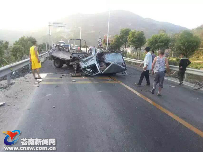 苍南新闻网8月3日消息:8月3日下午5点45分左右,在新78省道马站段与马站镇凤尾山村接口处发生一起东风牌大货车与柳州五菱带斗小货车、农用三轮车三车相撞交通事故,导致大货车侧翻、柳州五菱带斗小货车严重变形,造成柳州五菱带斗小货车驾驶员和农用三轮车驾驶员2人当场死亡,东风牌大货车驾驶员1人受伤。
