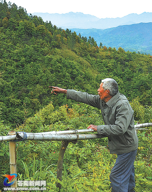 图为王思源老人指认当年被咬的地方(洪珠/摄)