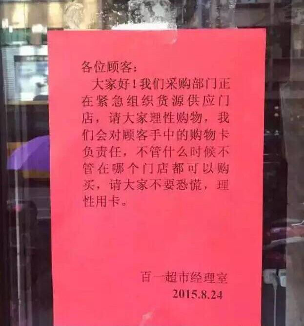 8月24日晚,百一超市通过各门店张贴、喇叭播报和网络平台发出“温州百一超市告广大顾客”一封信:“大家好!我们采购部门正在紧急组织货源供应门店,请大家理性购物,我们会对顾客手中的购物卡负责任,不管什么时候不管在那个门店都可以购买,请大家不要恐慌,理性用卡。”