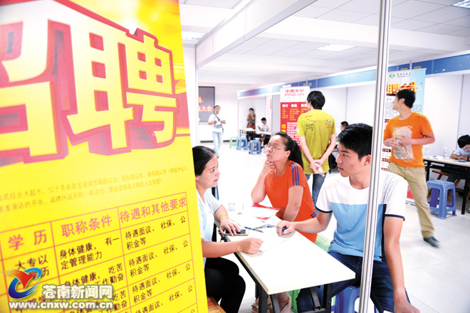 苍南新闻网9月20日消息:9月19日,我县秋季人力资源交流大会在县职业介绍指导服务中心举行。据了解,本次大会吸引了44家企业参会,1100多个岗位供待业者选择。在现场,记者发现待业者以“90后”为主,他们对工资薪酬没有太高要求,只是希望企业能提供就业锻炼机会。 (许师师/摄)