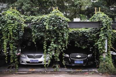 9月28日,望京西园四区一处立体车库,两辆汽车停在一层车位上,其上层车位已无法使用,爬满藤蔓植物。