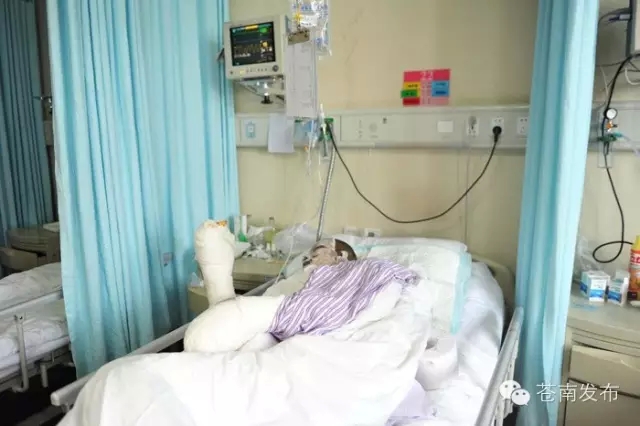 中午一点半左右,记者在温州附属第一医院433病区的重症室看到了苏式波,他手、脚、脸等多处都用纱布包裹着,正躺在病床上挂着点滴。他的侄女婿告诉记者,苏式波经过医生诊断全身烧伤面积在20%左右,特别是双手情况比较严重,达到了三度烧伤,预计医药费要十多万元。