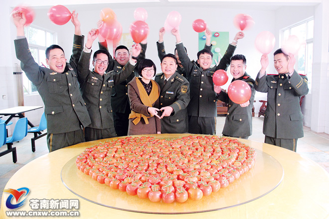 苍南新闻网2月15日消息:昨日,驻守在浙江最南端的苍南边防大队霞关边防派出所官兵为来队探亲的军嫂过了一个独特的情人节,他们用西红柿摆成一个巨大的爱心,祝福军嫂节日快乐。 (吴水斌/摄)