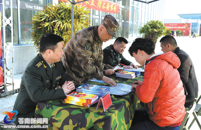 苍南新闻网3月14日消息:“小伙子,今年多大呀,有没有意向当兵?”今天,县人武部纪念《国防法》颁布十九周年国防宣传暨征兵工作宣传活动在苍南动车站广场举行。活动现场,工作人员设置国防宣传展板,并向过往群众分发宣传资料、作征兵政策咨询解答等。
