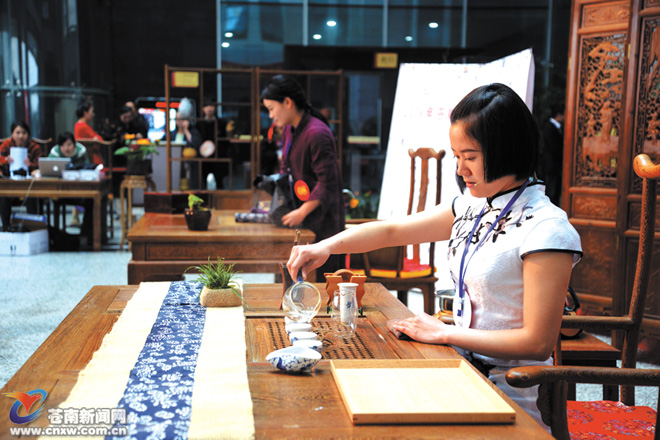 苍南新闻网3月20日消息:茶艺无疑是茶文化的精粹和典型的物化形式。3月18日,2016年苍南县茶艺技能大赛在县文博馆举行。来自全县28位茶艺相关从业人员为现场观众展现了一场精彩绝伦的茶艺盛宴。县政协主席张传君参加开幕式。