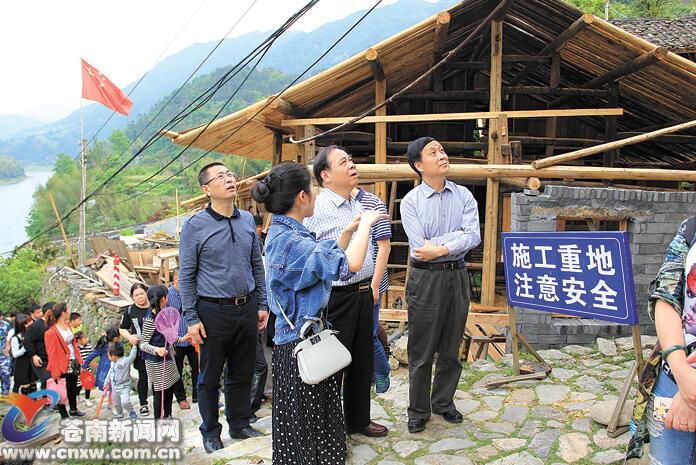 在碗窑古村落文化园里,大家徜徉于古村巷道中,细细体会村落古民居的建筑构造和文化内涵,温新超抚摸着陈氏吊脚楼的门板,向景区负责人了解该楼的建筑时间、建筑风格。