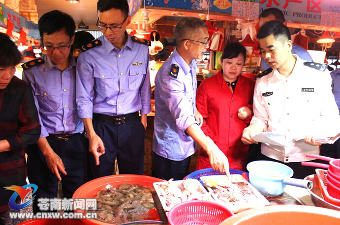 苍南新闻网5月9日消息:近日,为持续深入推进“一打三整治”和“幼鱼保护攻坚战”“伏季休渔保卫战”,灵溪市监分局组织力量对农贸市场、海鲜排挡、餐饮单位进行管控,并联合海洋与渔业局开展专项监管,对浙闽水产城进行彻查,检查在售海鲜产品是否有船证号与进货单、国外产品的报关单等。通过空前的执法力量投入和联动执法力度,为“史上最严”禁渔期加码,震慑违法违规行为。(潘小绿/摄)