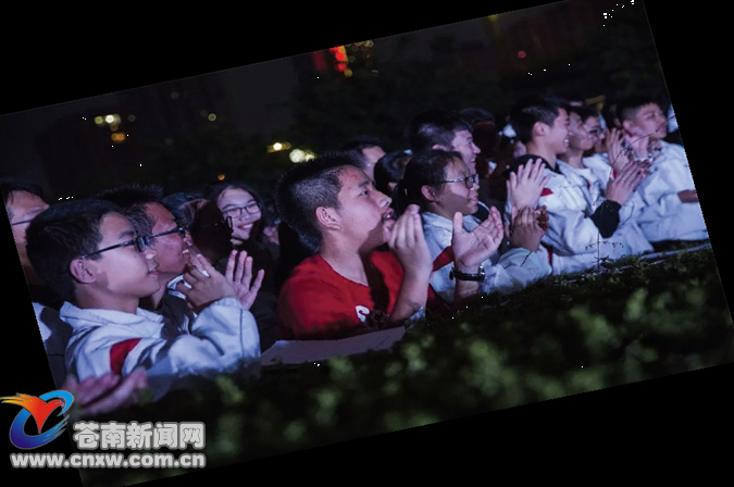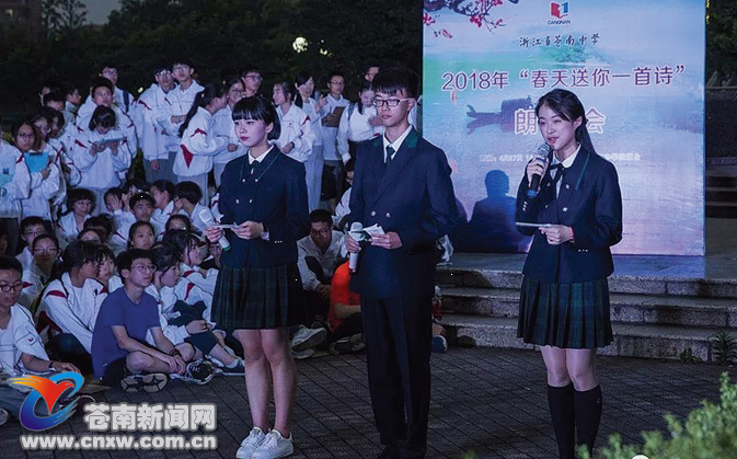 4月27日晚上六点半,苍南中学“2018春天送你一首诗朗诵会”在苍中后广场举行。《等你在雨中》《青春中国》《黄河》等15首诗篇,歌颂青春、歌颂梦想、歌颂祖国,在激情吟诵中,500余名师生陶醉在这春天的夜晚。(叶怀欣/摄)