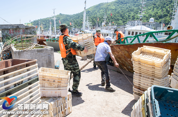 7月10日上午,舥艚边防派出所官兵帮助渔船民转移生产设备和生活物资。