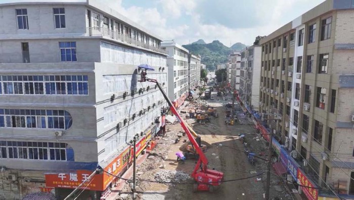 记者在现场看到,江湾路(玉苍路至大门三街)的封闭施工区域内,多台大型机械正在进行路面作业,一旁的房屋外立面改造也同步推进。据悉,该工程主要包括路面翻新、排水系统优化及交通设施升级。