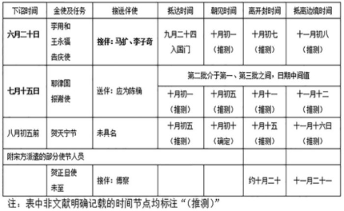 (一)首次详细梳理三批使团细节。本文基本厘清了各使团的下诏时间、主要使臣及在宋境活动时间线,给金国战前的“外交烟雾弹”做了本“台账”,填补了该历史节点使团活动的细节空白。