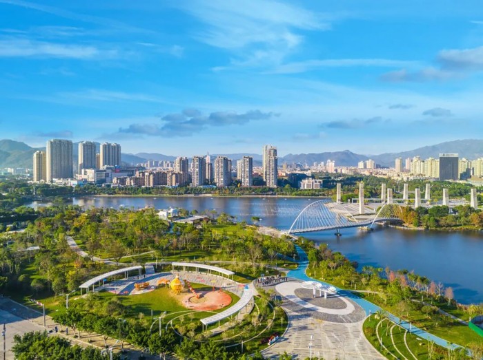 如果想暂别海岸的热烈,县城中心湖公园便是“漫享”之选。这片占地约722亩的城市绿心,由昔日水利设施蝶变而来,约0.154平方公里的湖面波光粼粼,彩虹桥横跨其上,是俯瞰全景的绝佳打卡点。